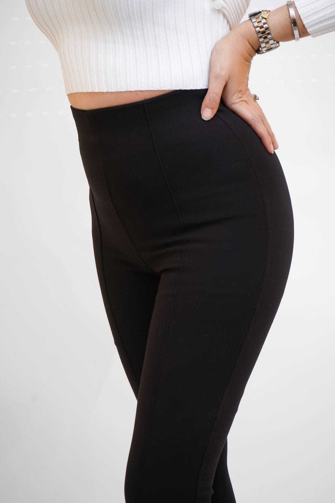 Conçu pour allier élégance et confort, il met en valeur la silhouette grâce à sa coupe évasée au niveau des jambes et sa taille haute. Les nervures délicates apportent une texture raffinée, tandis que le détail des ajoute une touche moderne et originale, idéale pour sublimer vos chaussures.